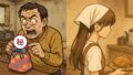 ブラック気質の社長が、新入社員に「メダル」を渡す場面をコミカルに描いたイラスト。疲れ果てた新人の表情が、当時の異様な雰囲気を物語っています。